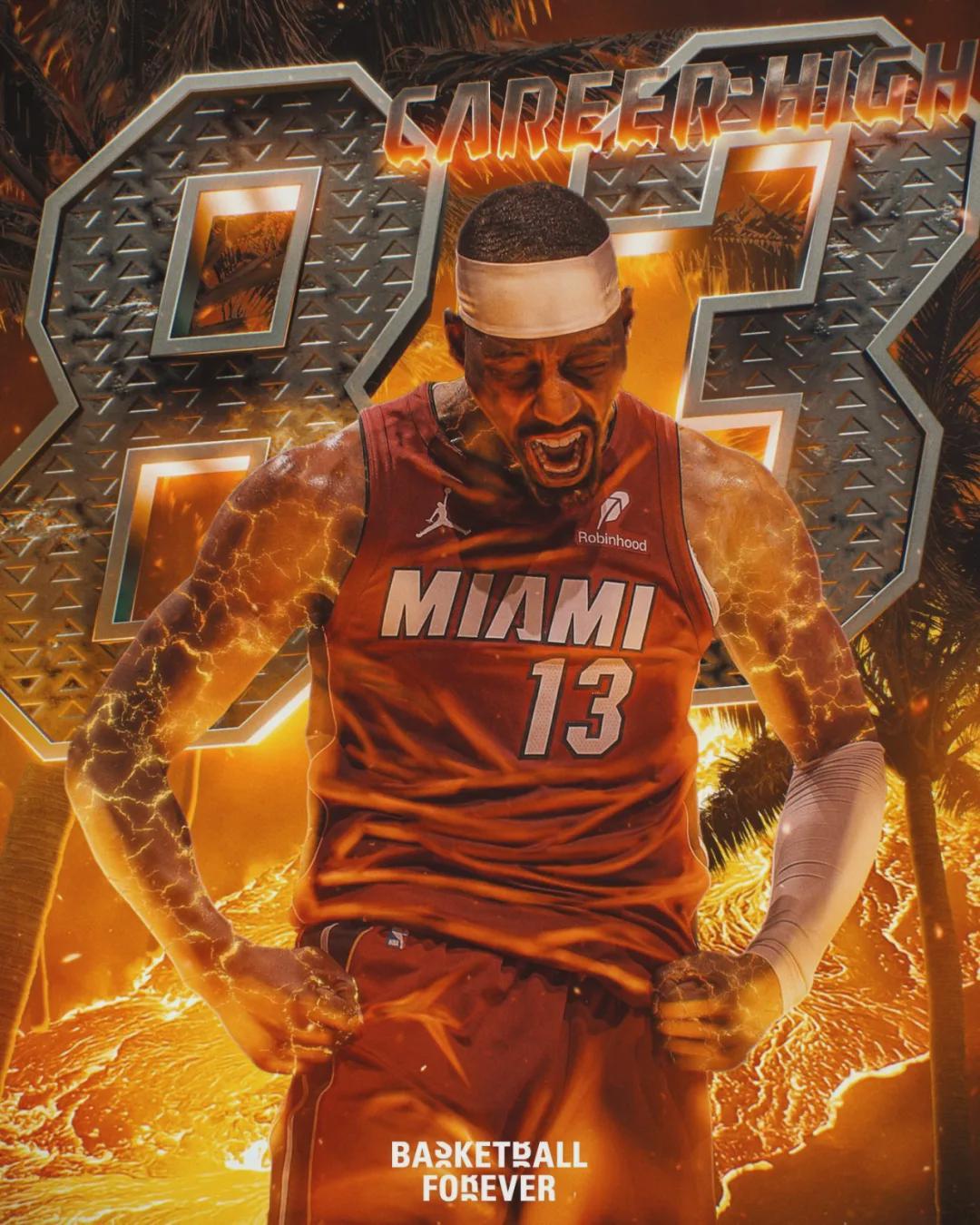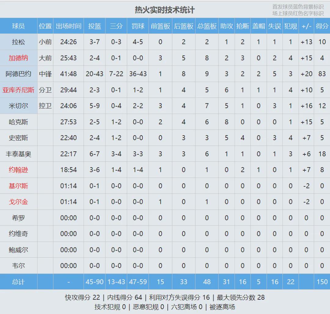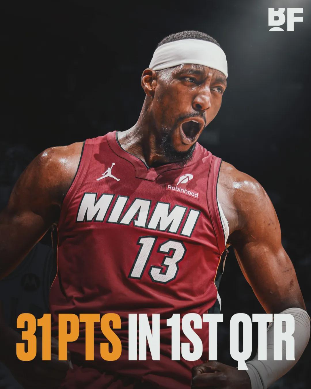 如果算上所有單節(jié)得分,自1996-97賽季以來,阿德巴約單節(jié)31分排名歷史第五,前四名分別是:克萊37分,樂福34分,安東尼33分,唐斯32分。上半場阿德巴約狂轟43分4籃板2搶斷1蓋帽,已經(jīng)打破生涯單場得分紀錄(41分)。
