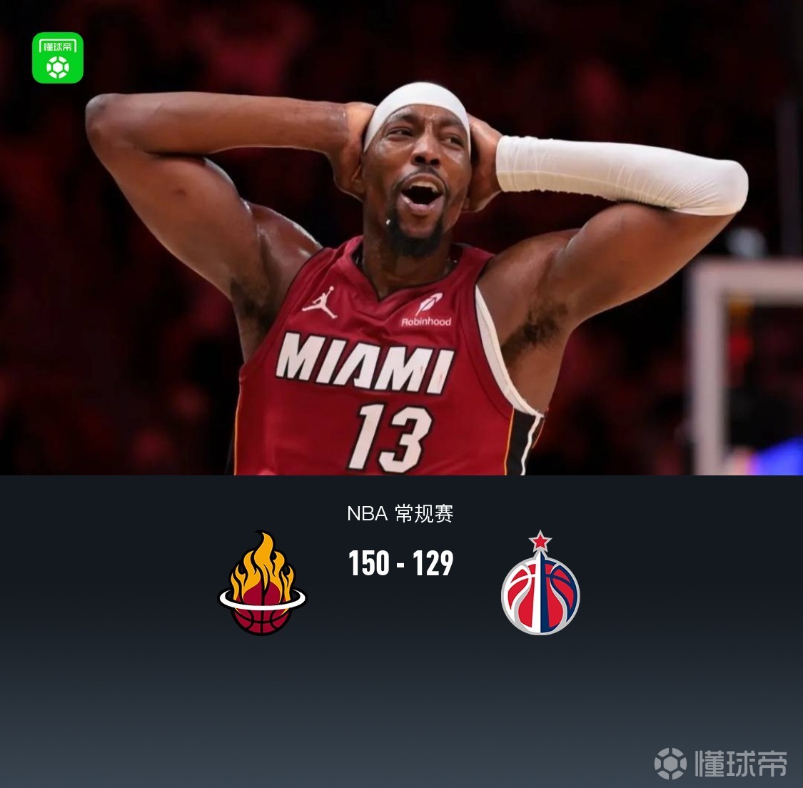 第四節(jié)熱火阿德巴約拿下21分,奇才杰登-哈迪拿下9分,最終熱火150-129戰(zhàn)勝奇才