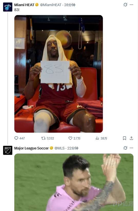 邁阿密熱火官推發(fā)布阿德巴約手舉83分照片,美職聯(lián)官推評(píng)論配上了梅西鼓掌的動(dòng)圖。